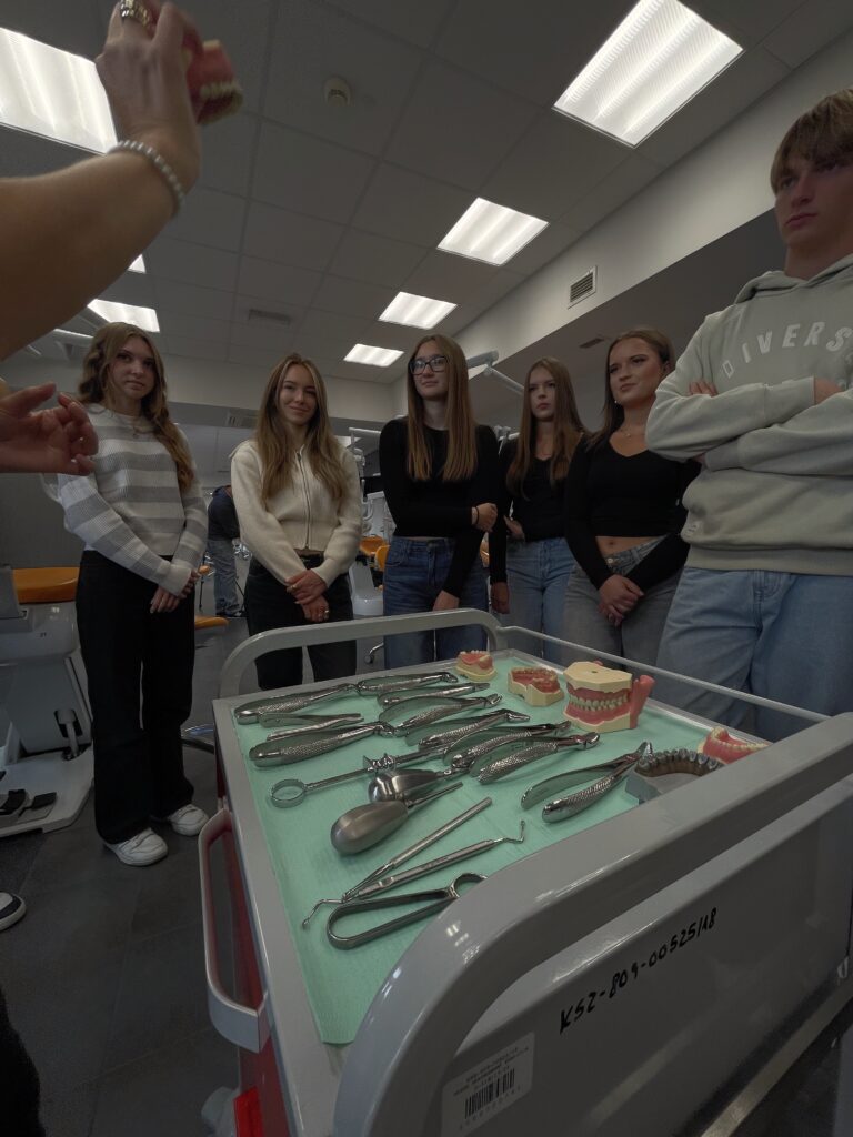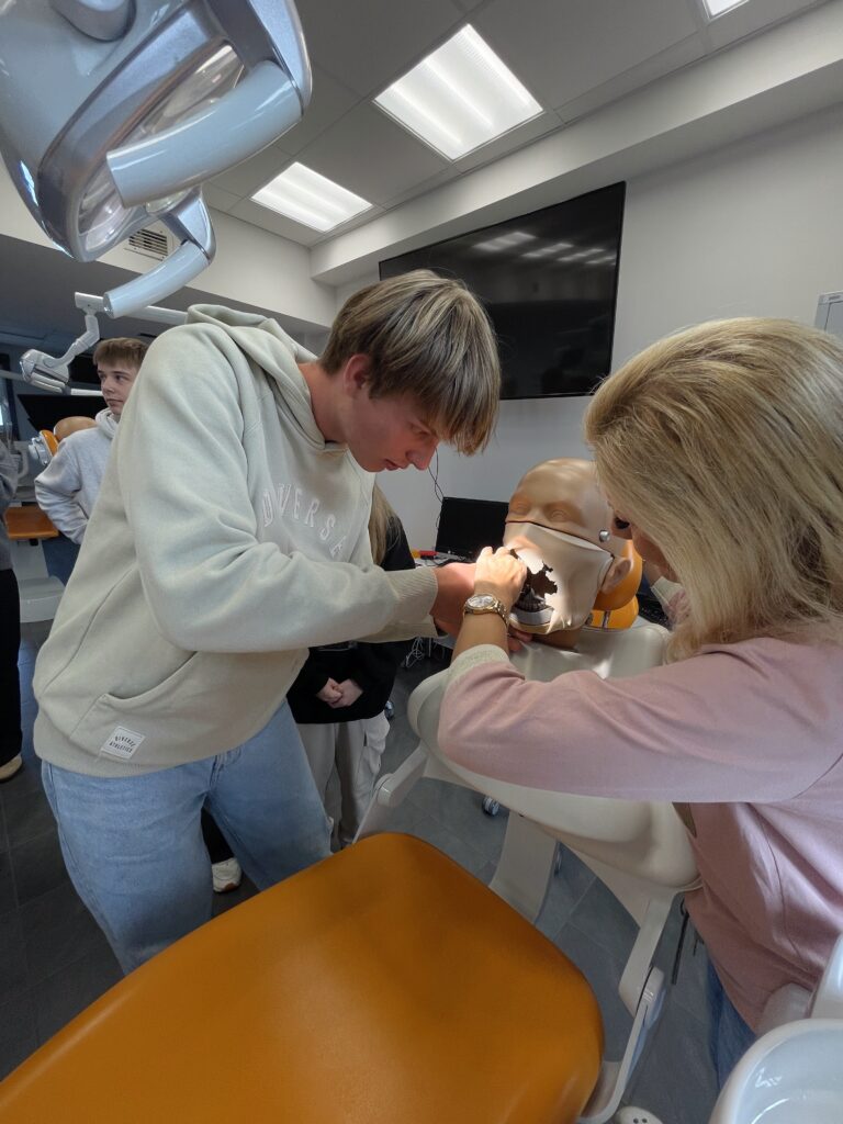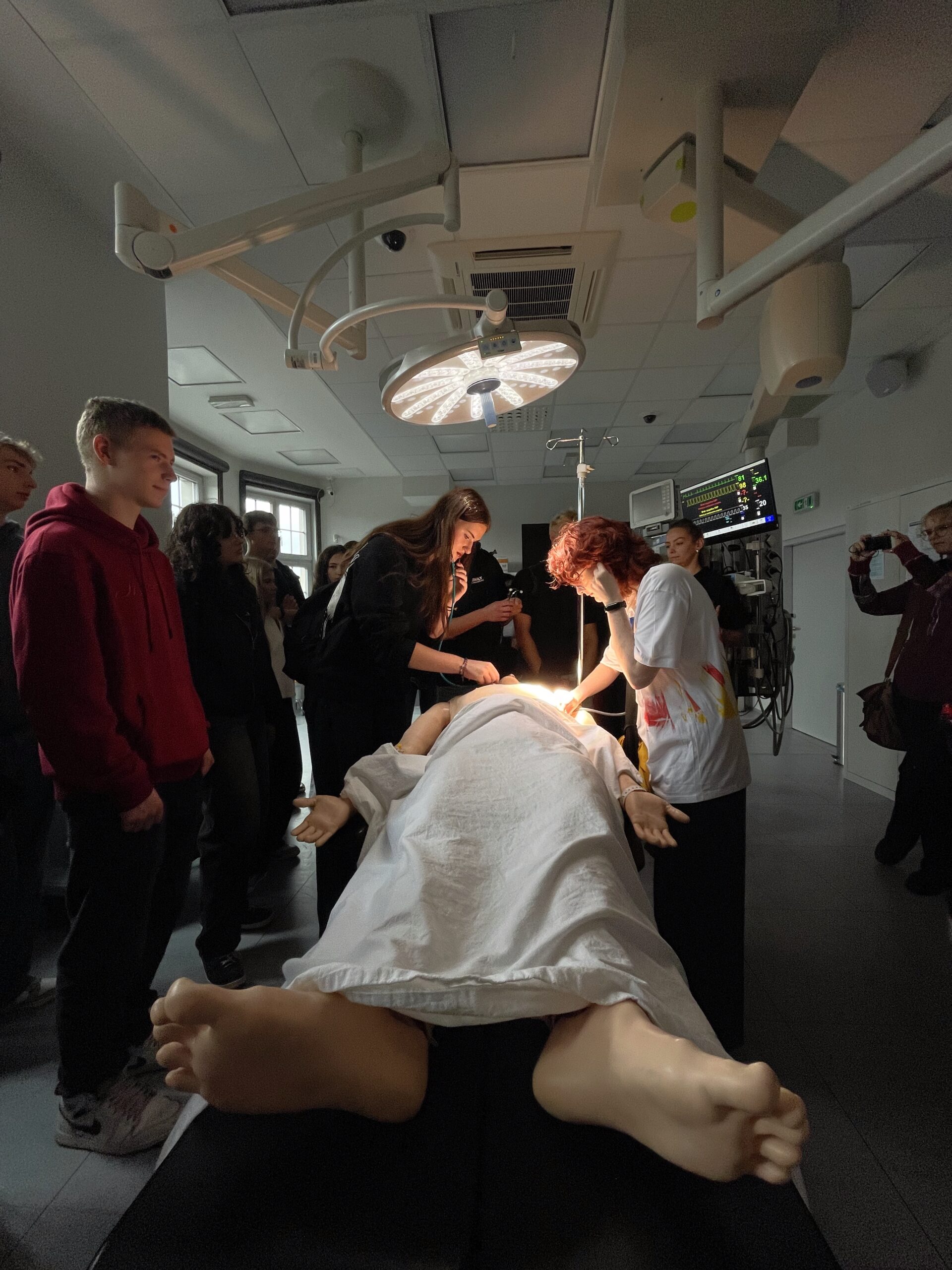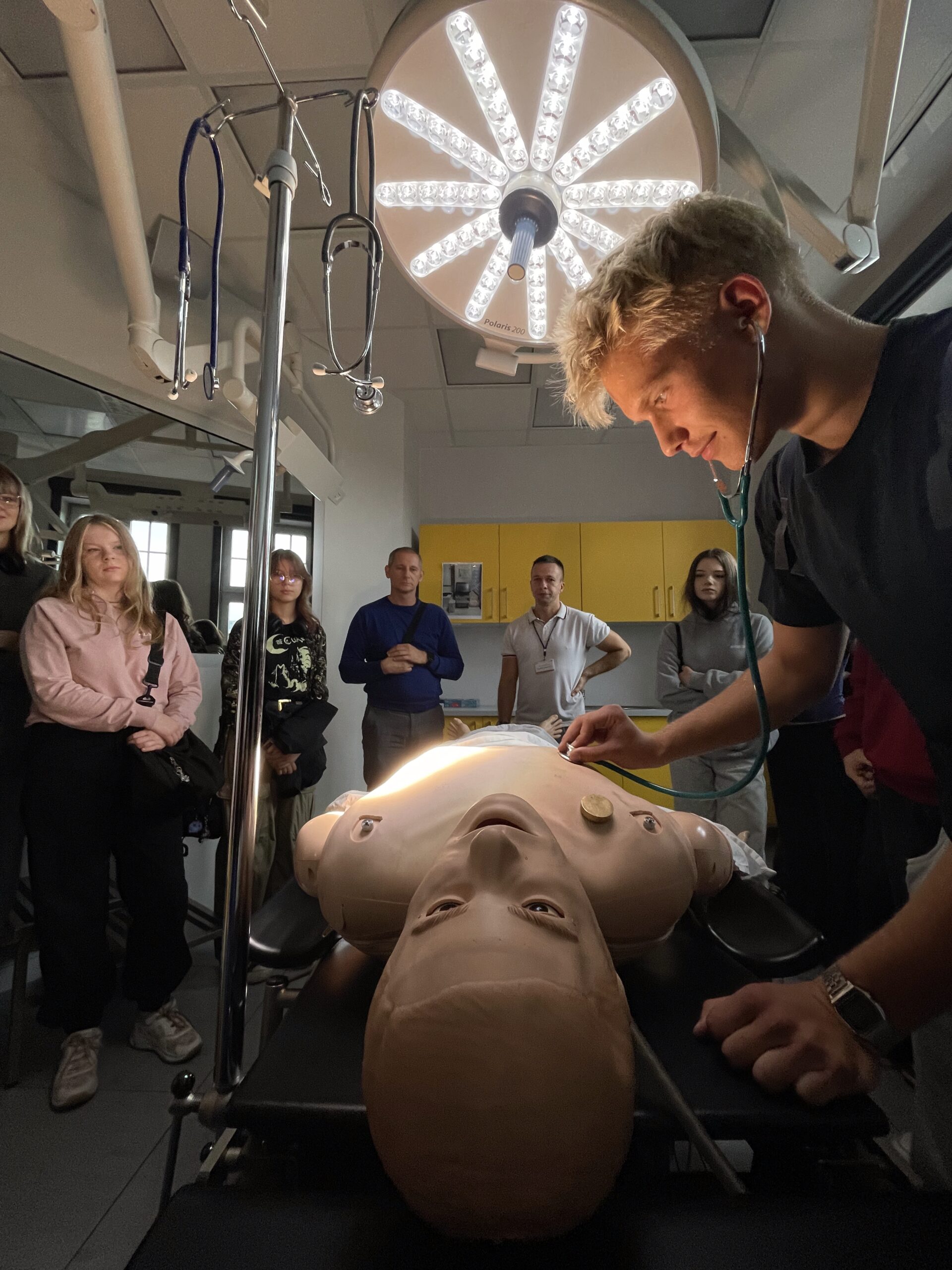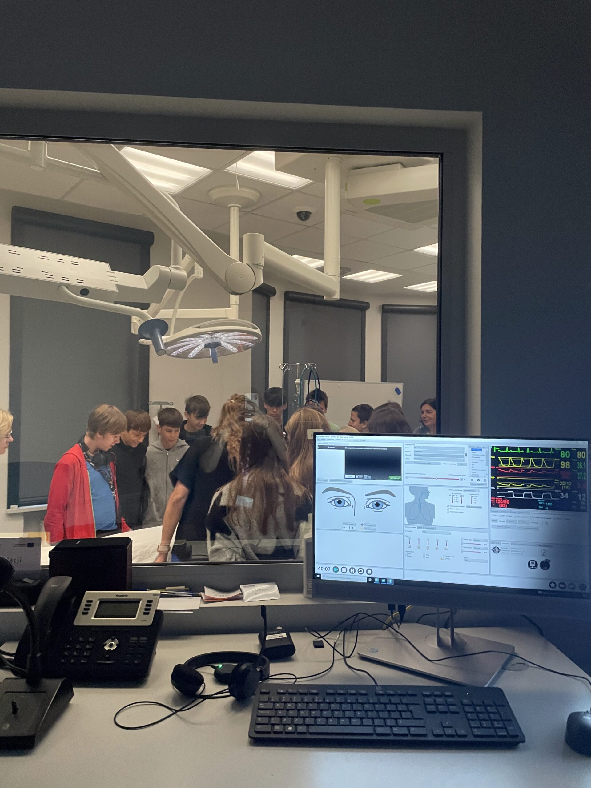 Zademonstrowaliśmy im sale wysokiej wierności i niskiej wierności, pokazując jak działają nasze symulatory. Uczniowie mieli okazje osłuchać klatkę piersiowa za pomocą stetoskopu i usłyszeć jak brzmi zdrowe i zmienione chorobowo płuco oraz mieli okazje przeprowadzić procedurę intubacji. Na Sali stomatologicznej mieli okazje wyrwać zęba czy usiąść na fotelu dentystycznym i poznać sprzęt medyczny, którzy używają dentyści w swoich gabinetach. Zwieńczeniem wycieczki było odwiedzenie 5 pietra, gdzie znajduje się karetka Zespołu Ratownictwa Medycznego.