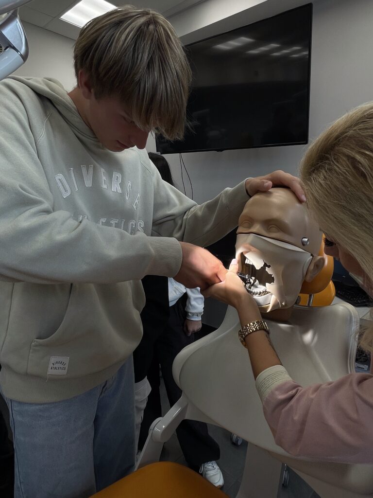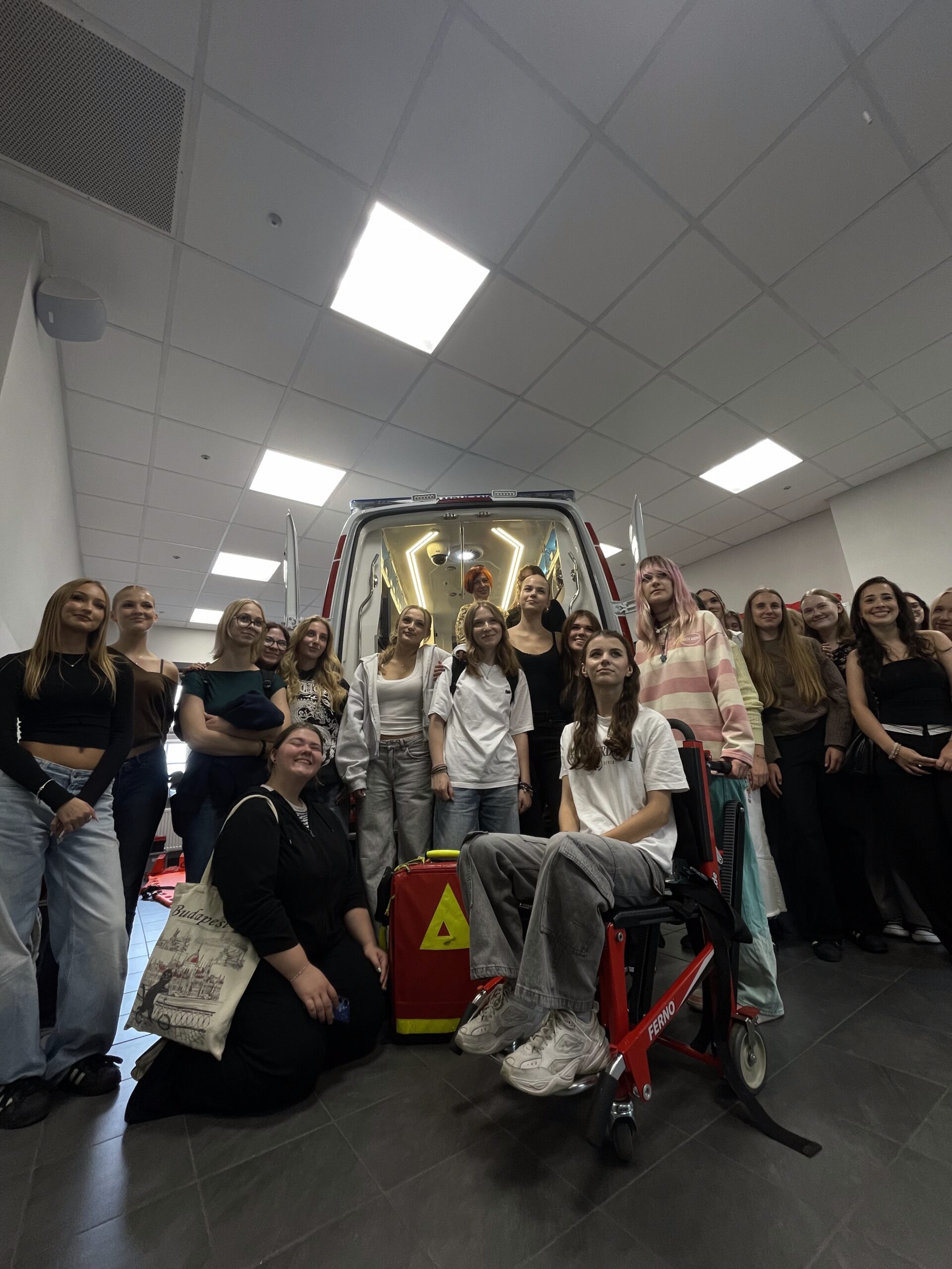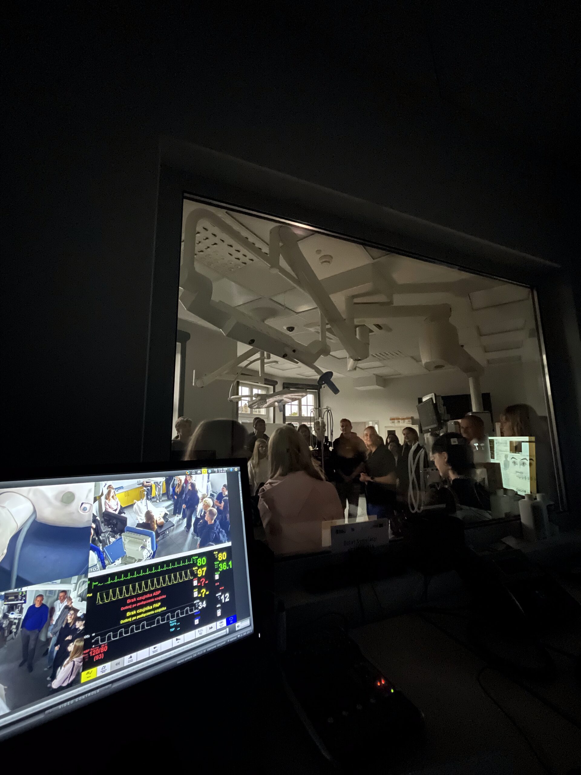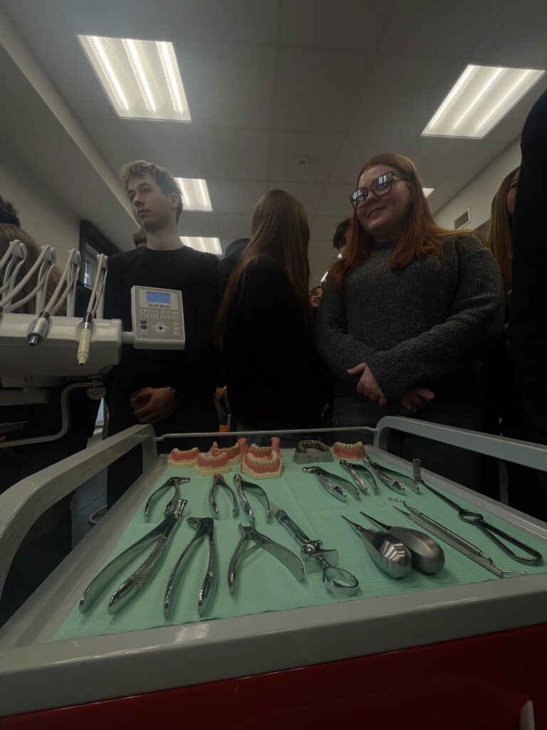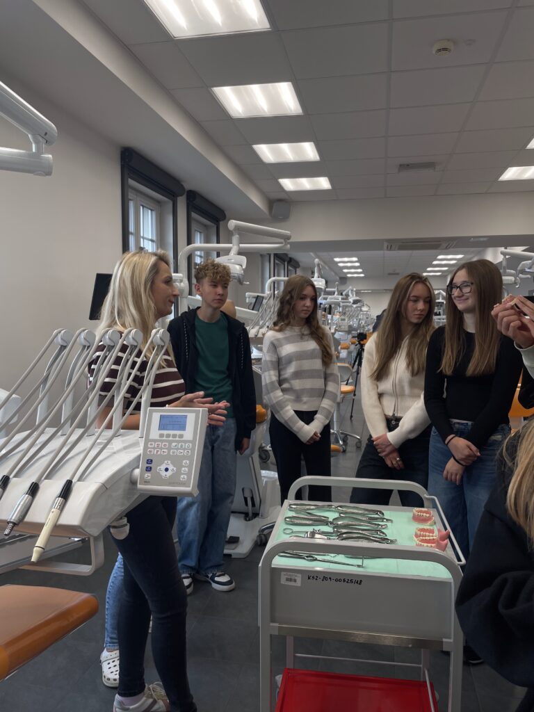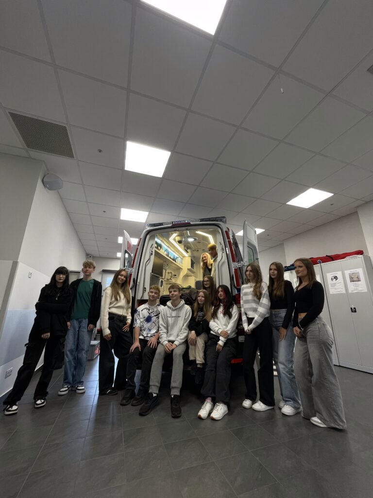 Zademonstrowaliśmy im sale wysokiej wierności i niskiej wierności, pokazując jak działają nasze symulatory. Uczniowie mieli okazje osłuchać klatkę piersiowa za pomocą stetoskopu i usłyszeć jak brzmi zdrowe i zmienione chorobowo płuco oraz mieli okazje przeprowadzić procedurę intubacji. Na Sali stomatologicznej mieli okazje wyrwać zęba czy usiąść na fotelu dentystycznym i poznać sprzęt medyczny, którzy używają dentyści w swoich gabinetach. Zwieńczeniem wycieczki było odwiedzenie 5 pietra, gdzie znajduje się karetka Zespołu Ratownictwa Medycznego.