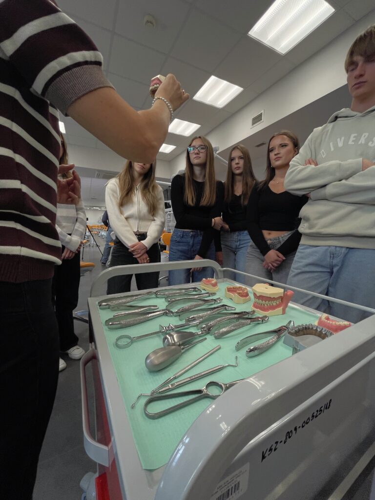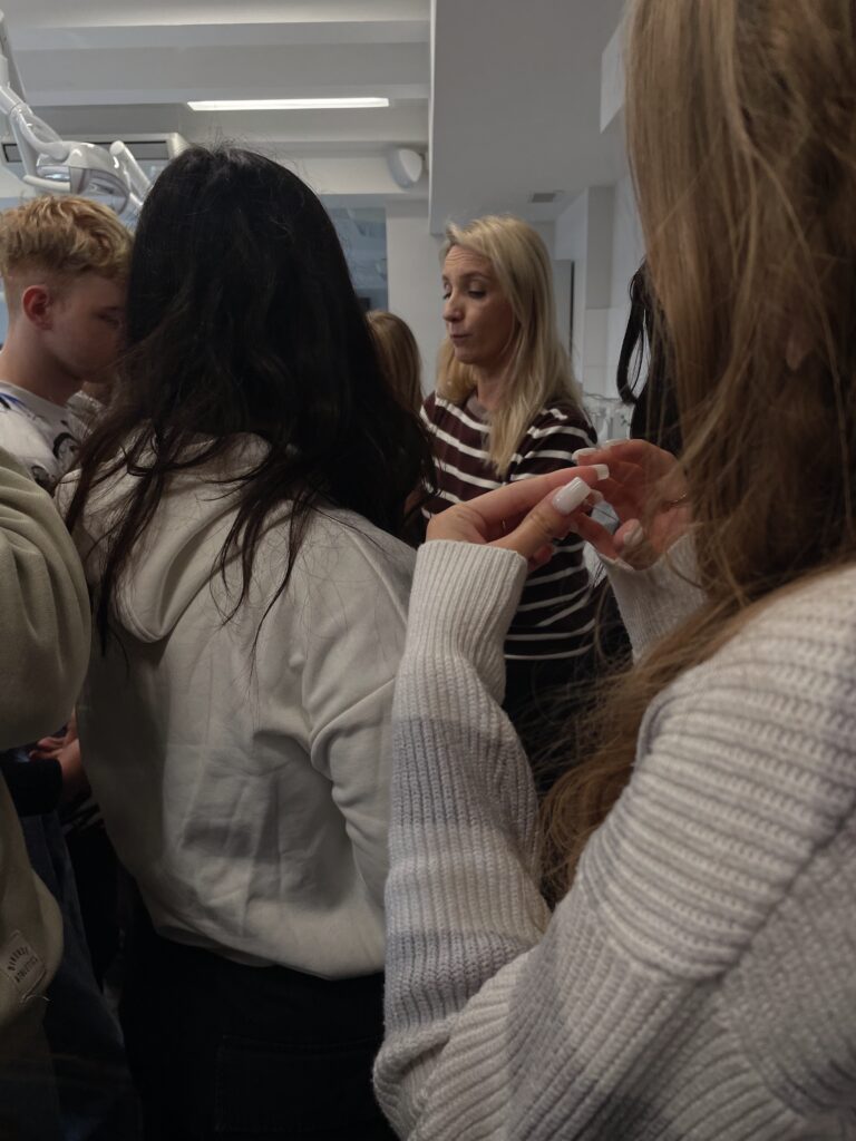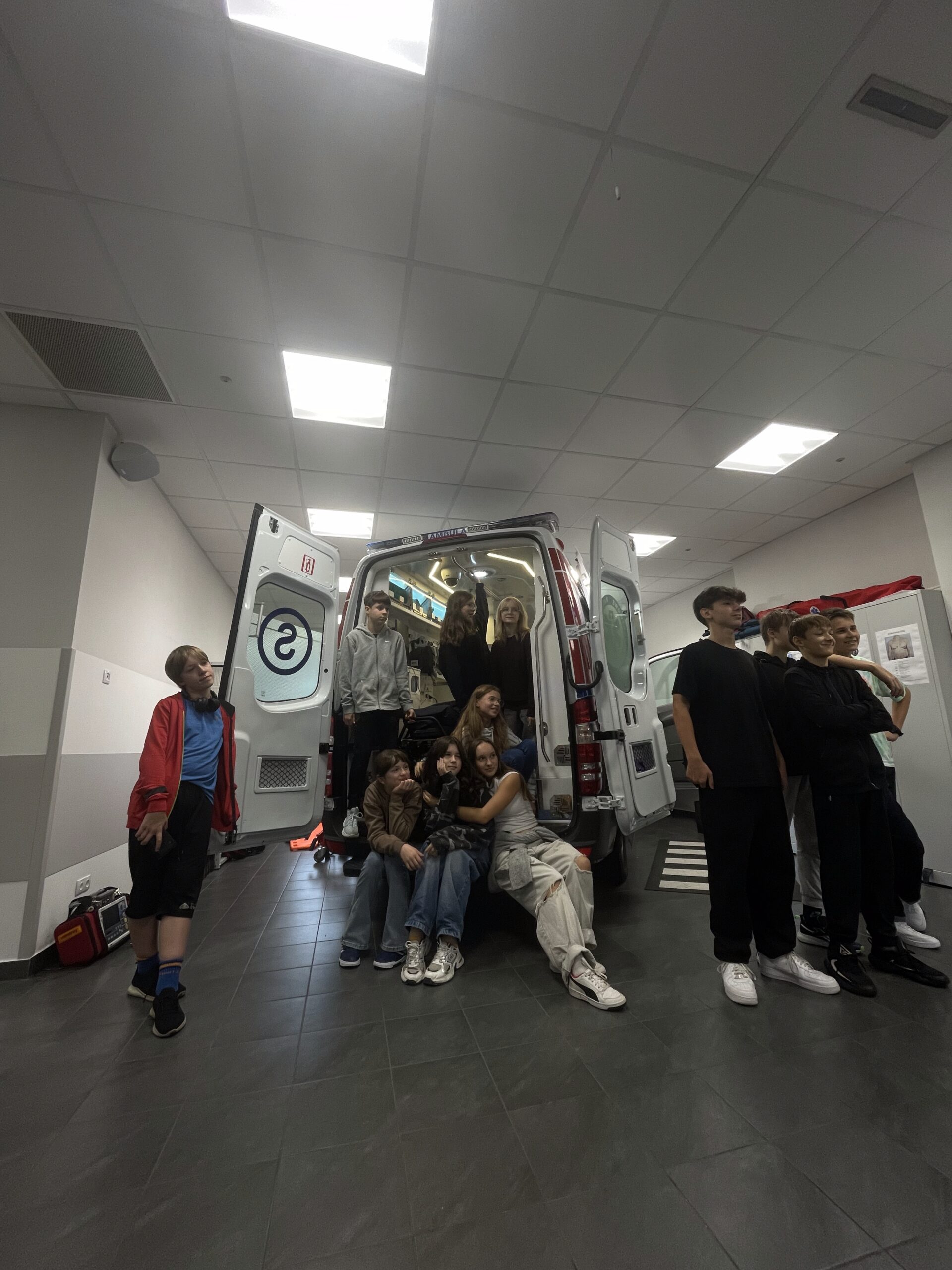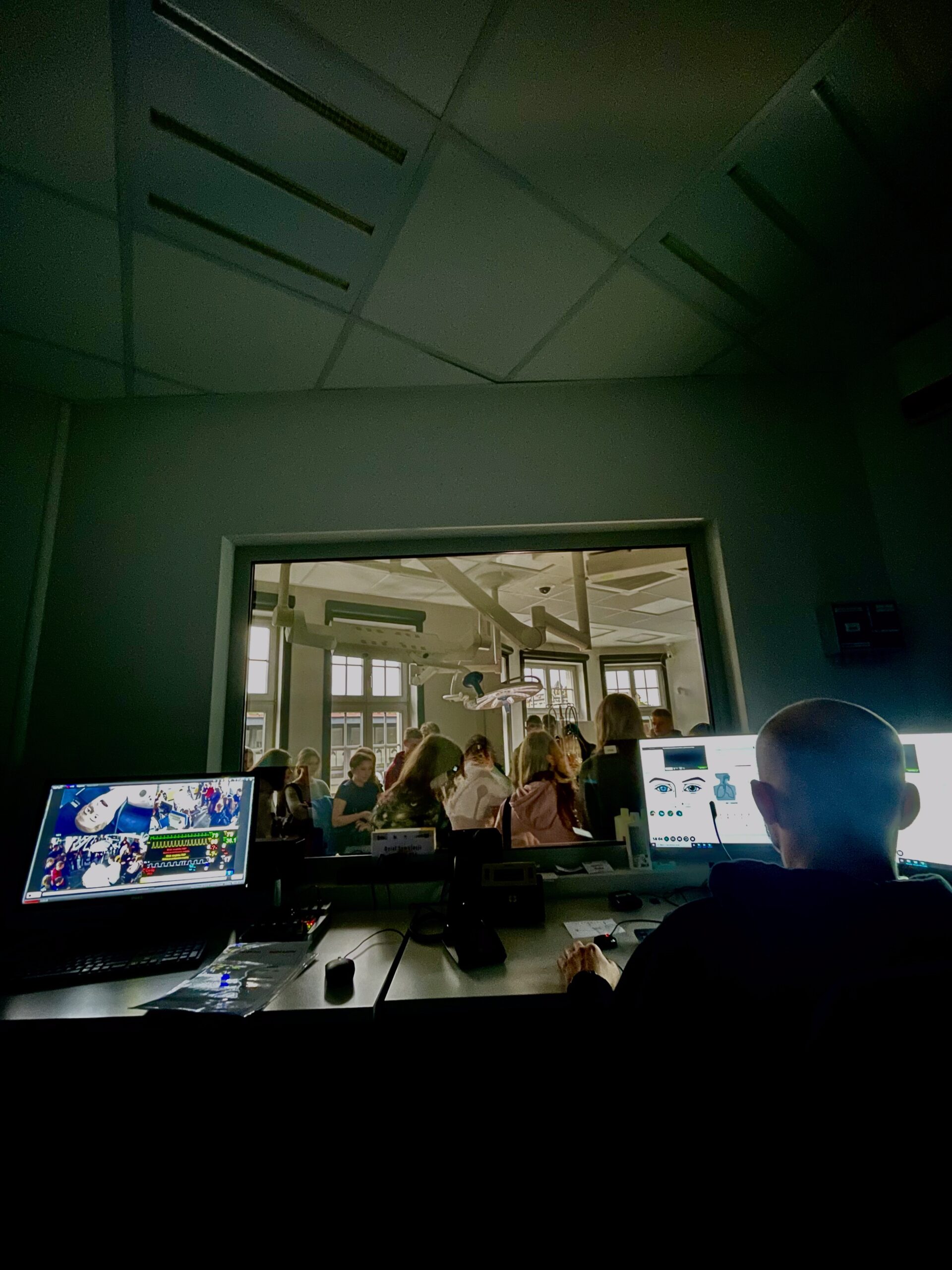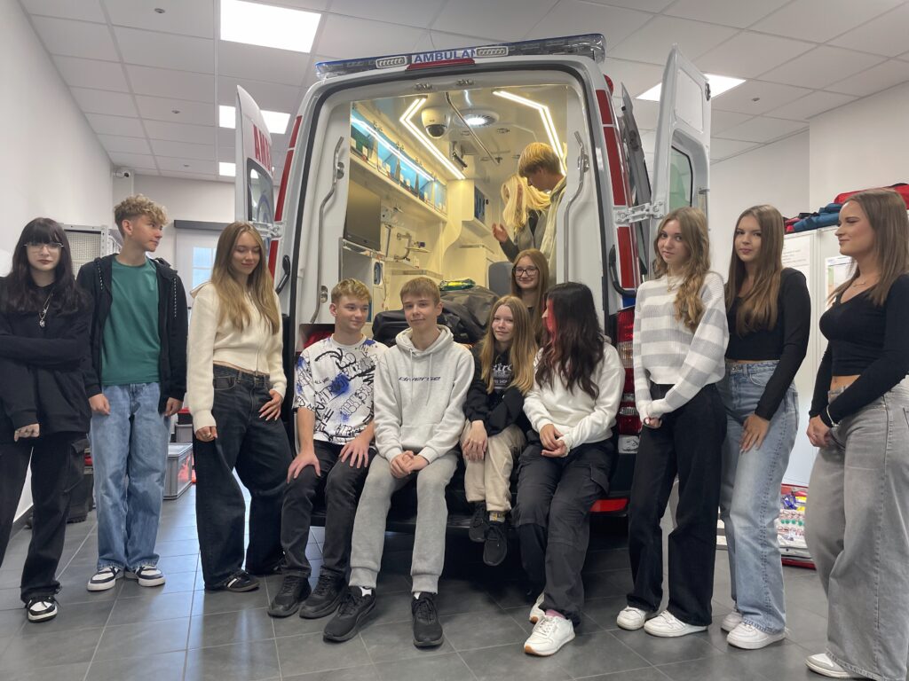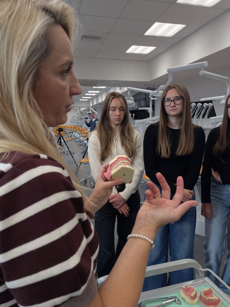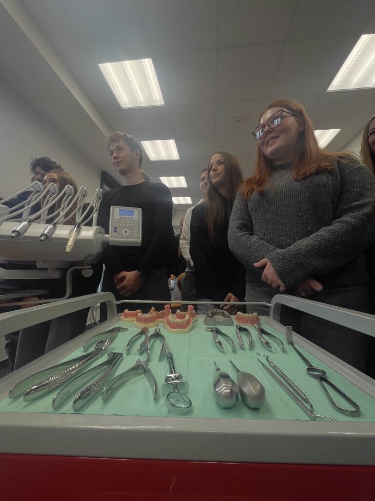 Zademonstrowaliśmy im sale wysokiej wierności i niskiej wierności, pokazując jak działają nasze symulatory. Uczniowie mieli okazje osłuchać klatkę piersiowa za pomocą stetoskopu i usłyszeć jak brzmi zdrowe i zmienione chorobowo płuco oraz mieli okazje przeprowadzić procedurę intubacji. Na Sali stomatologicznej mieli okazje wyrwać zęba czy usiąść na fotelu dentystycznym i poznać sprzęt medyczny, którzy używają dentyści w swoich gabinetach. Zwieńczeniem wycieczki było odwiedzenie 5 pietra, gdzie znajduje się karetka Zespołu Ratownictwa Medycznego.